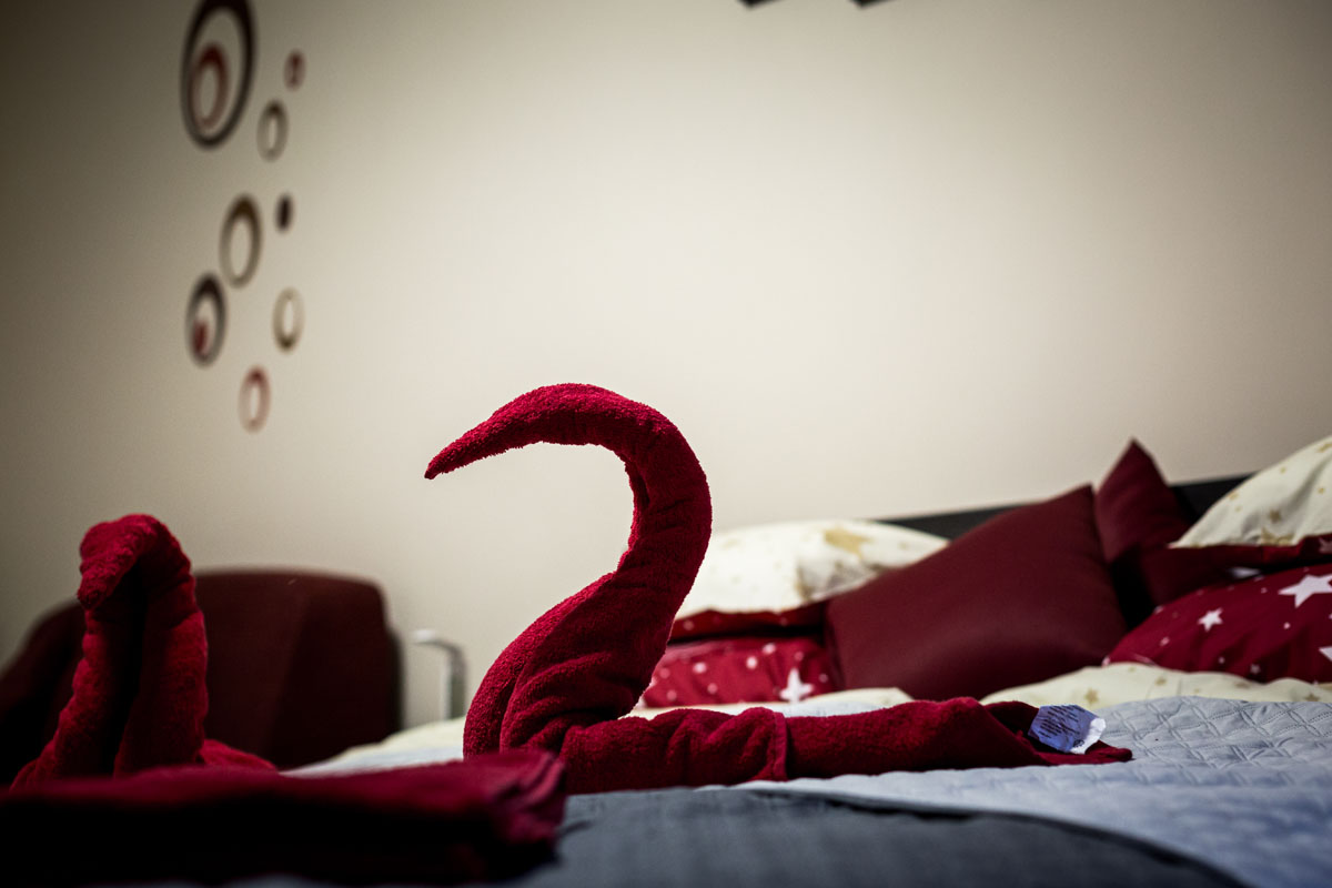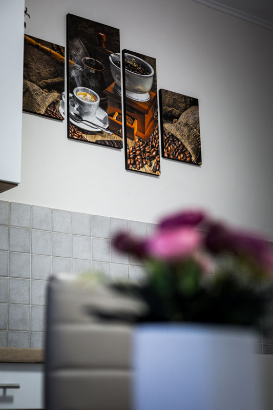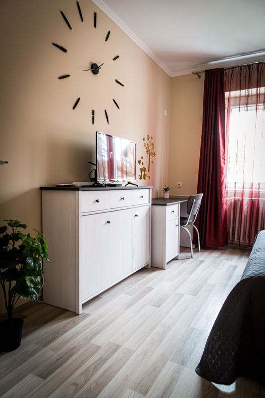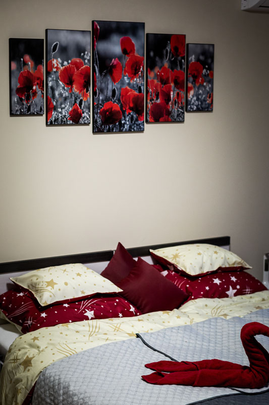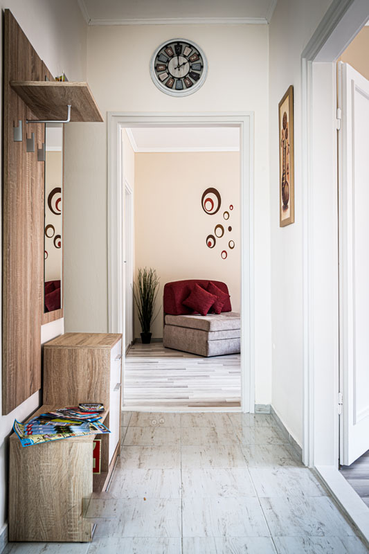 Az apartman alapterülete 75 m2, folyosóból, két hálószobából, gardróbszobából (széffel), fürdőszobából, külön WC-ből és jól felszerelt konyhából állnak.
